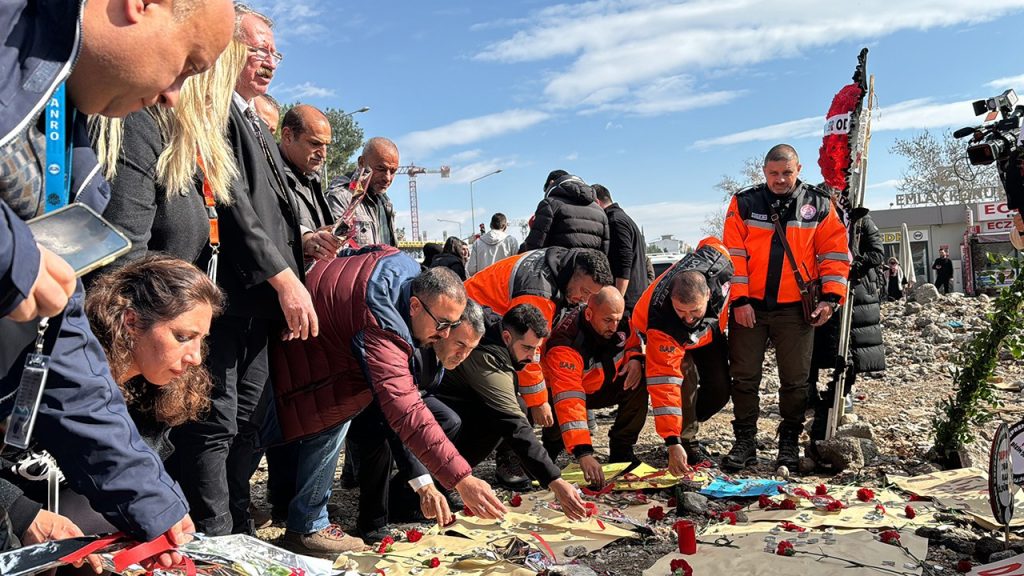 TUREB Başkanı Hakan Eğinlioğlu ile beraberindeki heyet, enkaz alanında depremde hayatını kaybedenler için saygı duruşunda bulundu, alana karanfil bıraktı.